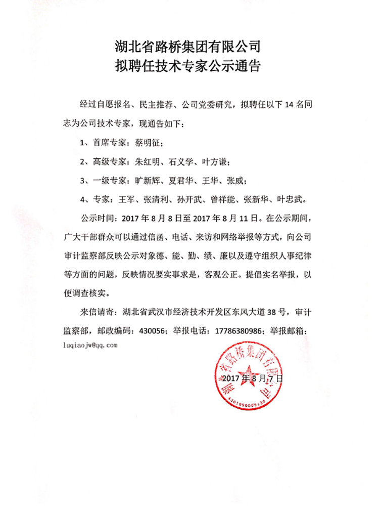 湖北省路橋集團有限公司擬聘任技術(shù)專家公示公告