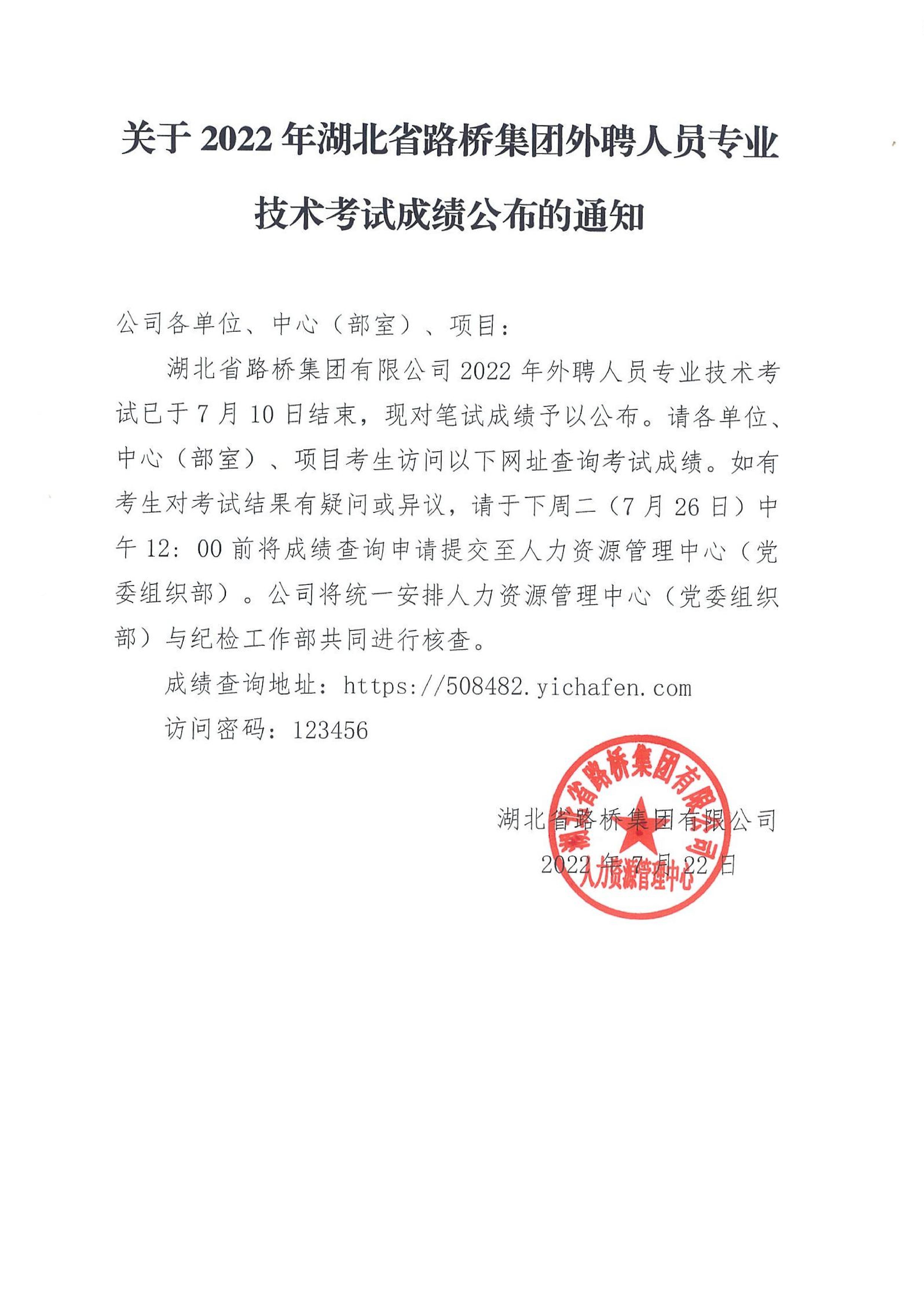 關于2022年湖北省路橋集團外聘人員專業技術考試成績公布的通知