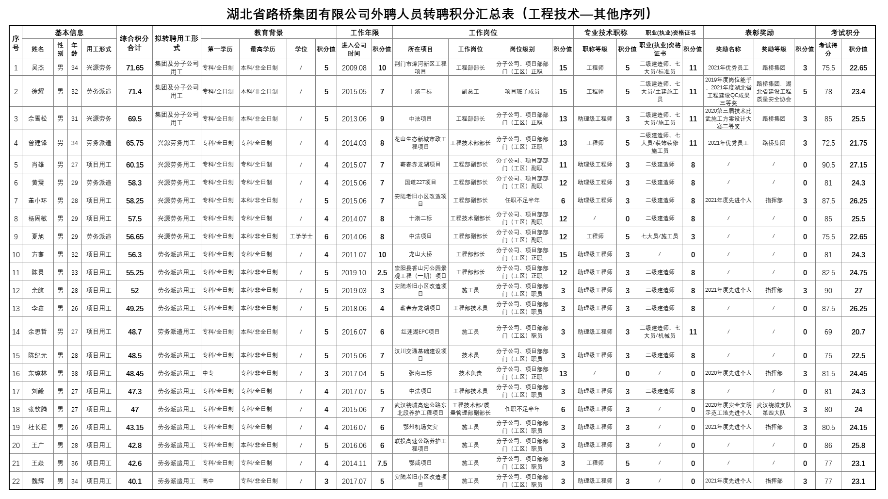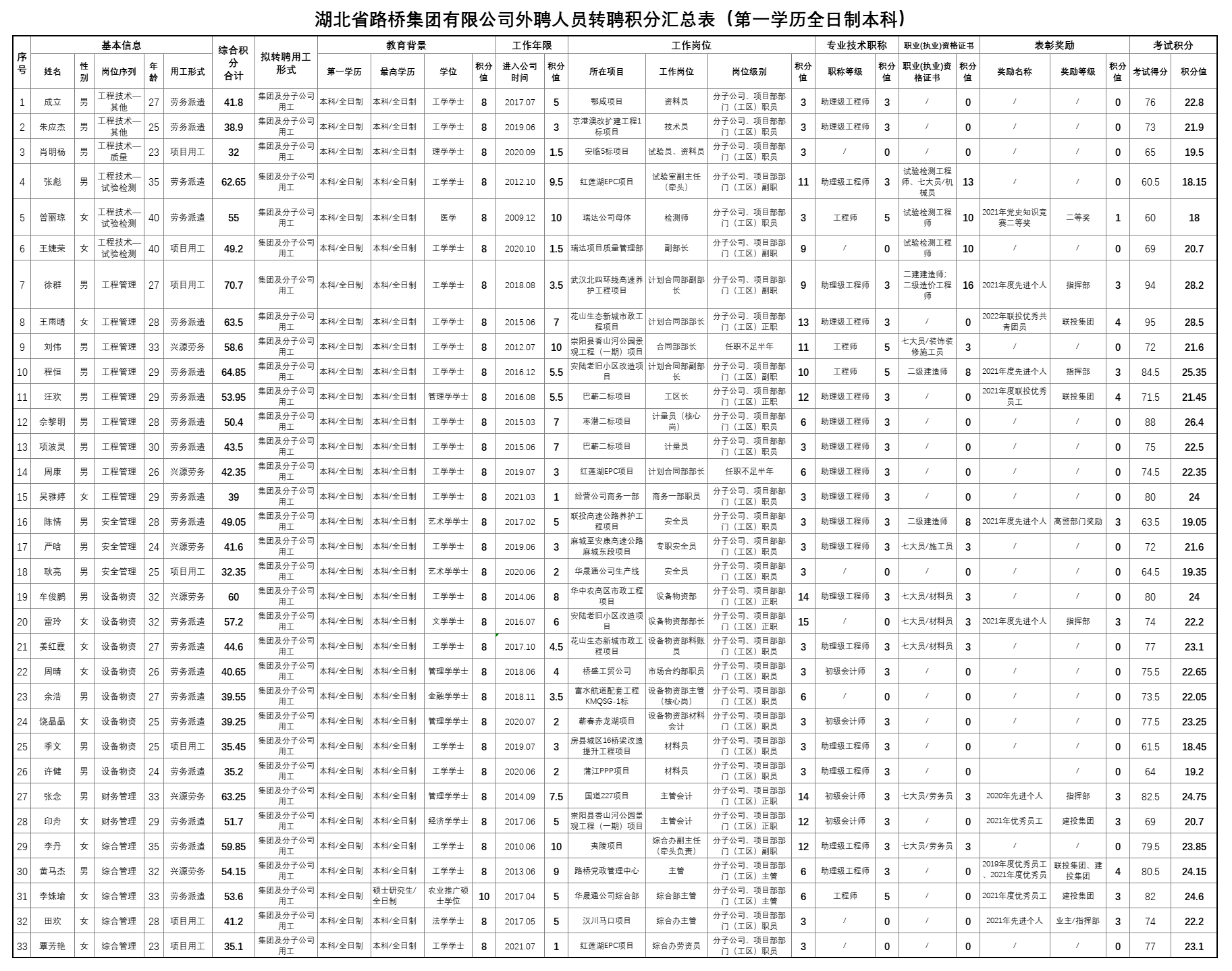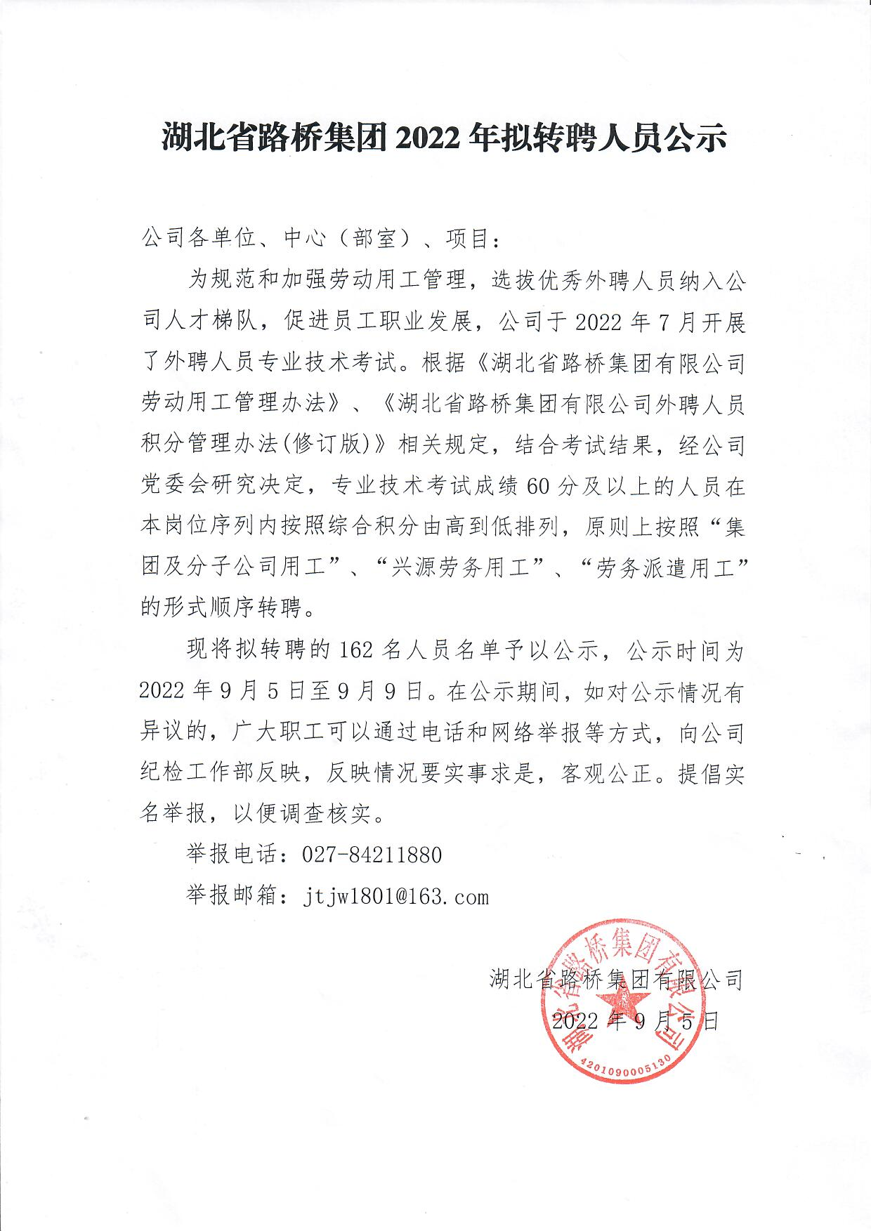 湖北省路橋集團有限公司2022年擬轉聘人員公示