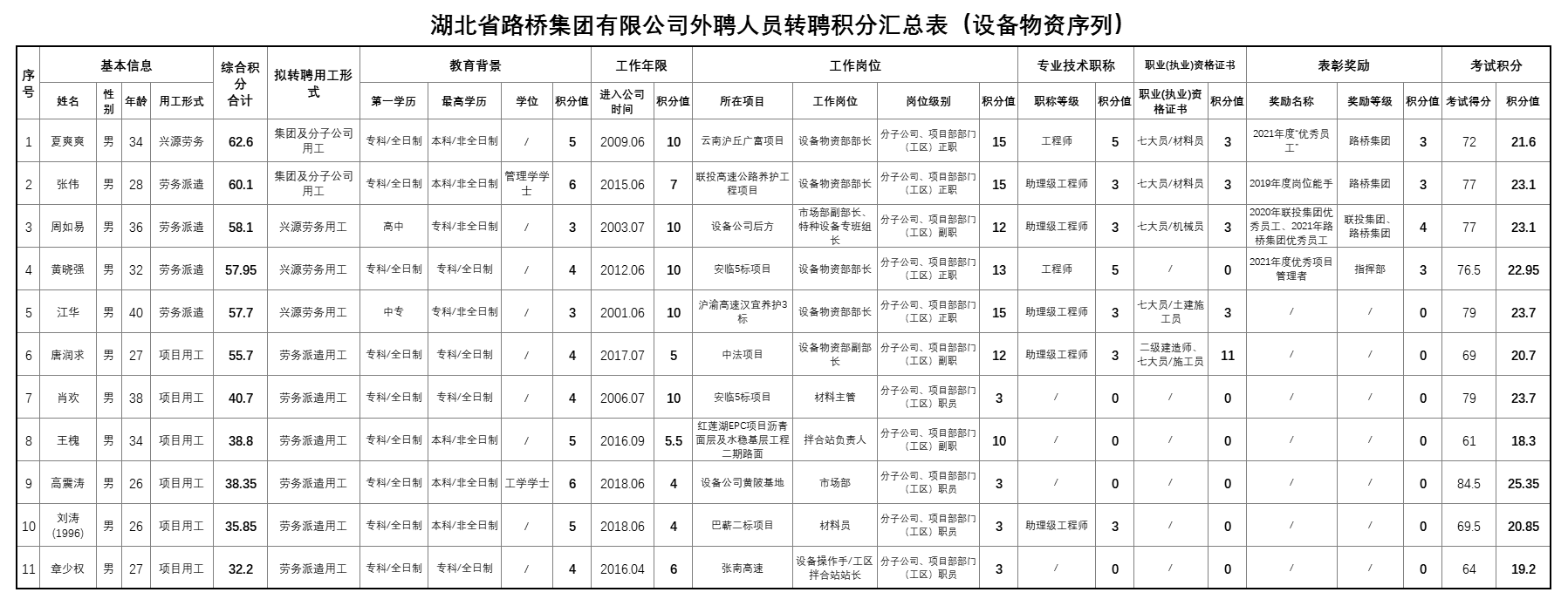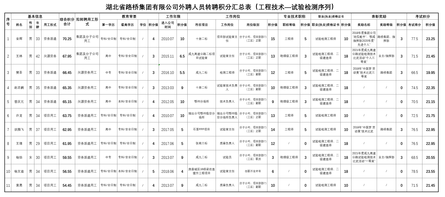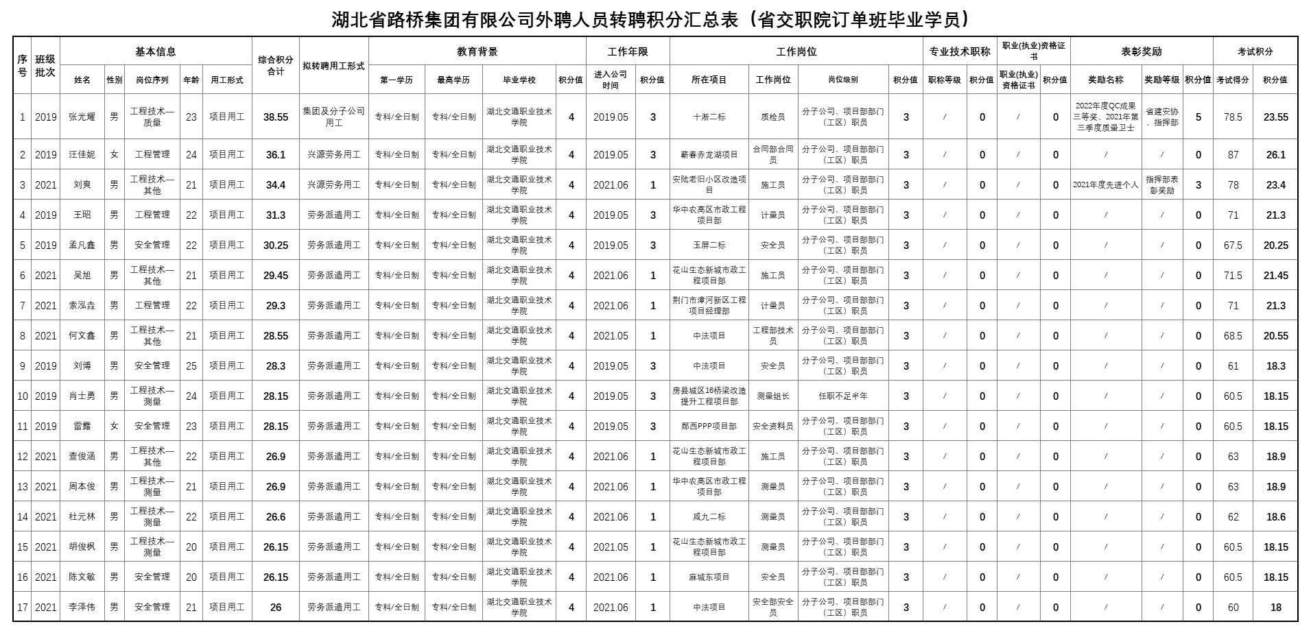 湖北省路橋集團有限公司2022年擬轉聘人員公示