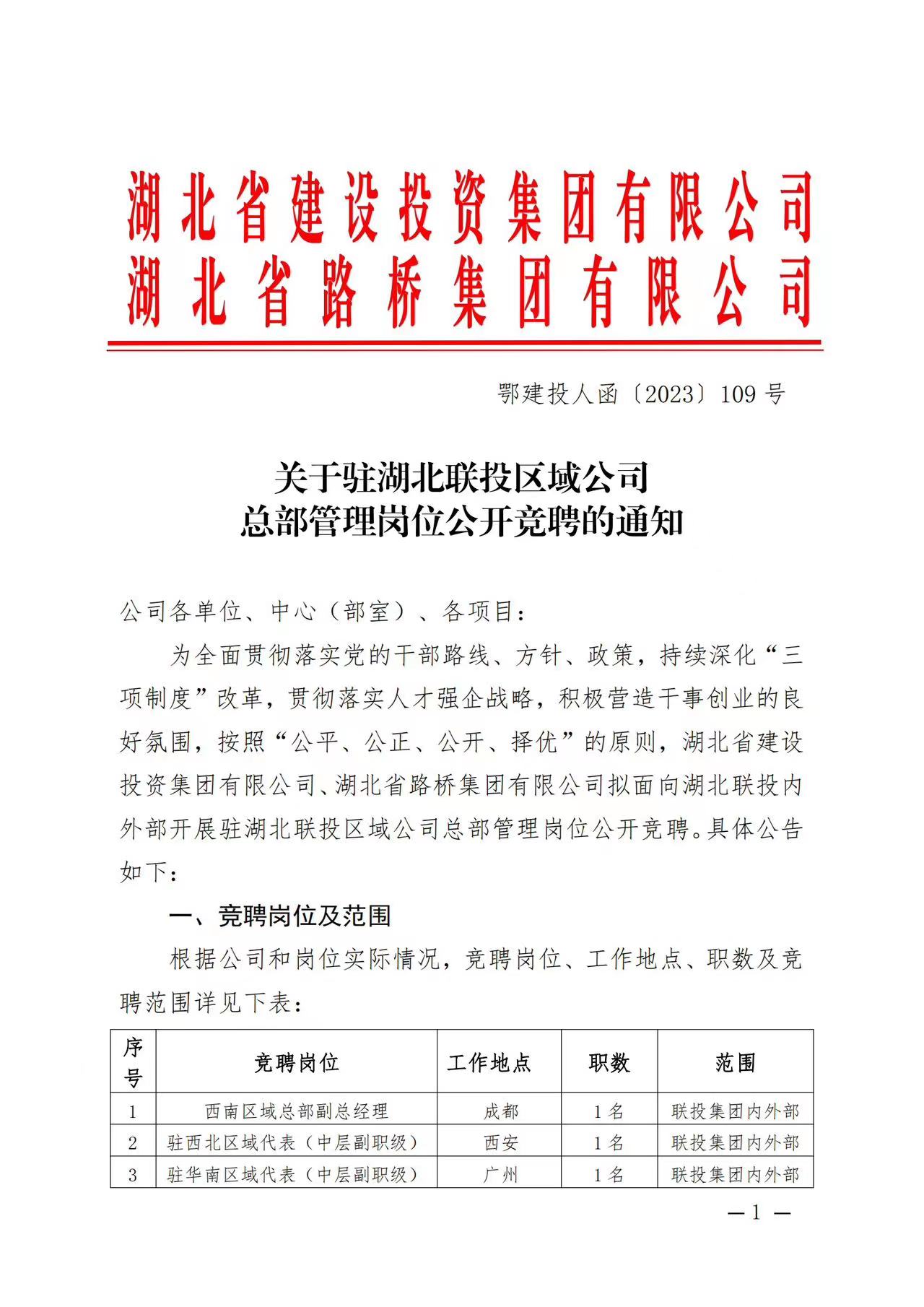 湖北省建設投資集團有限公司、湖北省路橋集團有限公司駐湖北聯投區域公司總部管理崗位公開競聘報名初審公示