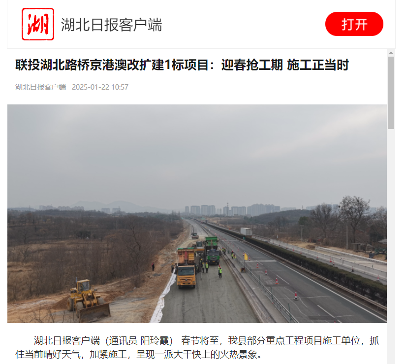 1月22日,湖北日報報道了聯投湖北路橋京港澳改擴建1標搶抓晴好天氣,大干快上的火熱景象,以下是報道全文: