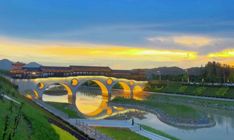 西河拱橋位于老西河拱橋北面,全長106m,采用27+37+27m上承式鋼筋混凝土拱橋結構,橋拱采用古風古韻的風雨廊橋造型,與房縣《詩經》文化遙相呼應。